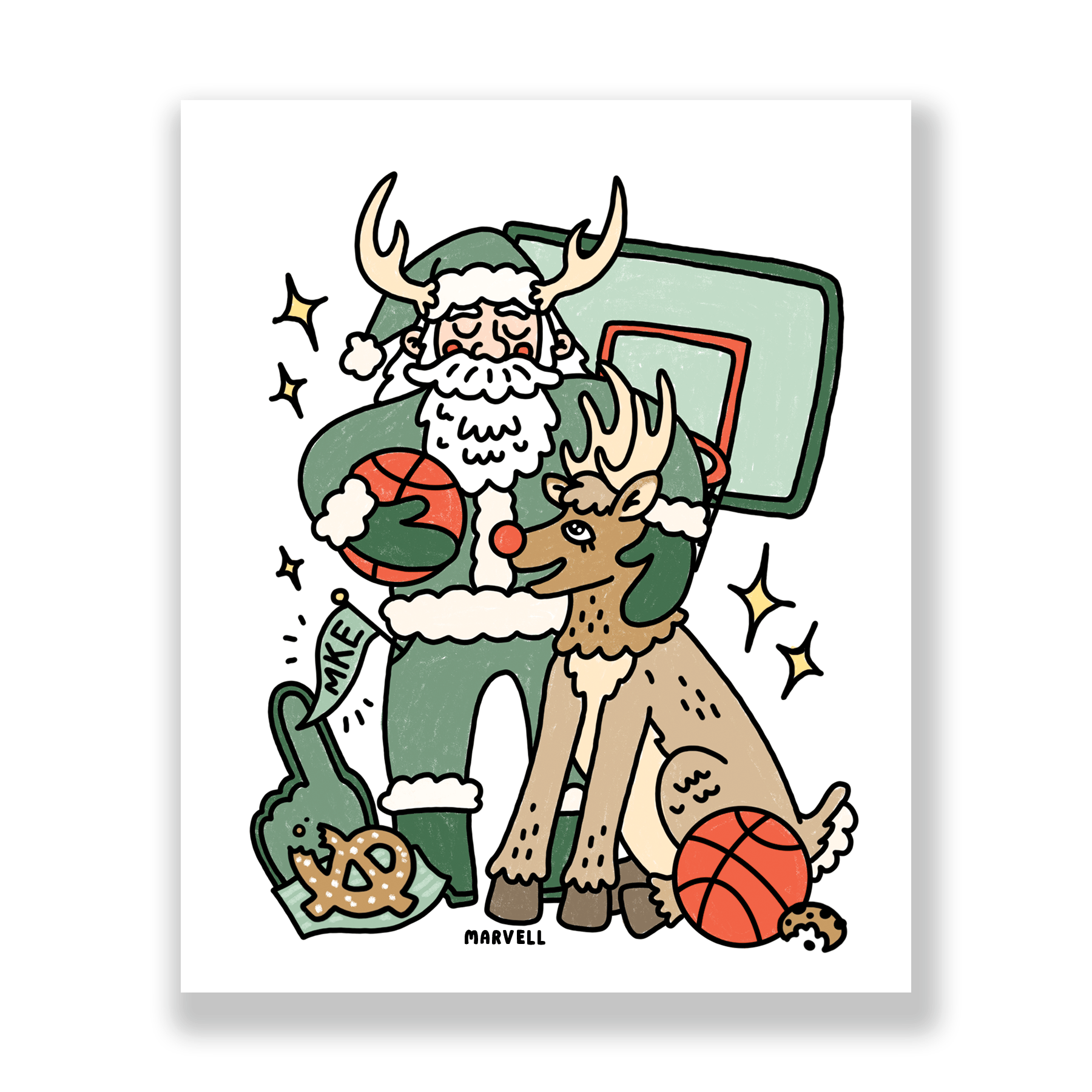He shoots.... and Santa SCORES!! Join him and his reindeer companion in celebrating MKE Basketball! Don't forget to pick up a soft pretzel